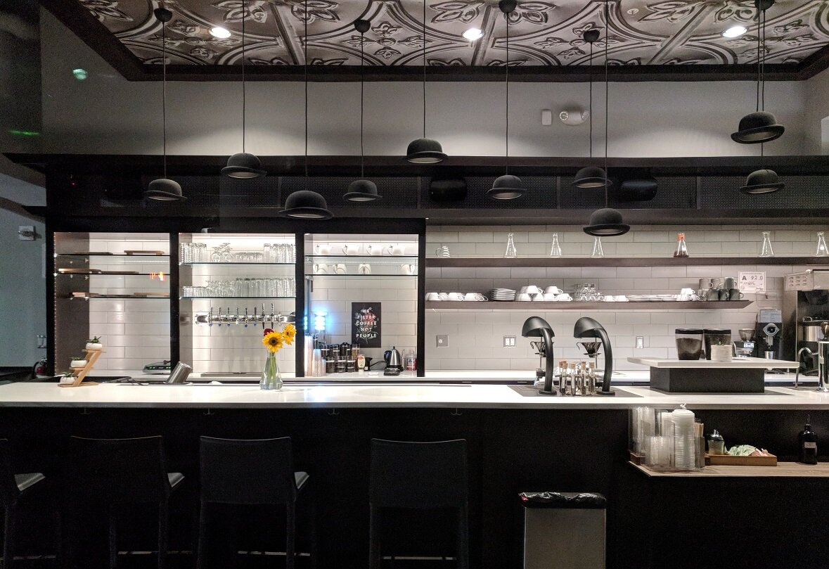 Interior of 42 & Lawrence Coffee Shop with tiled overhang and bowler hat lamps in Raleigh, NC via Mad Hatters NYC Blog
